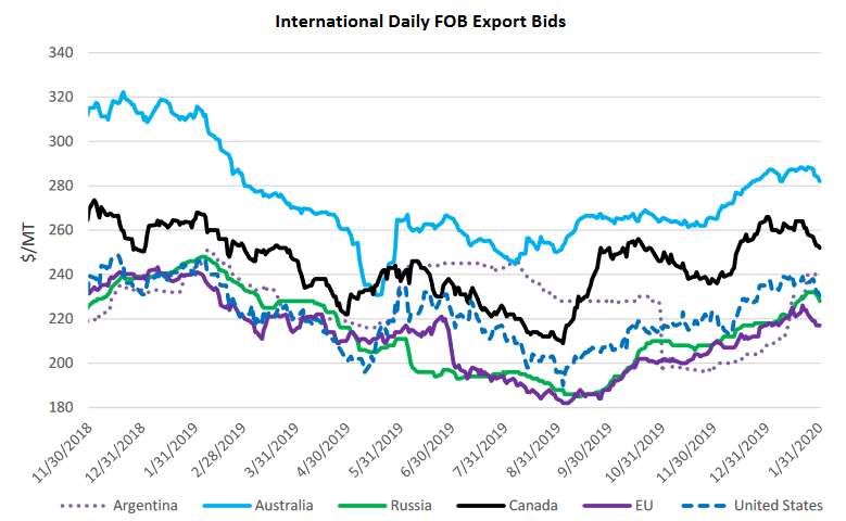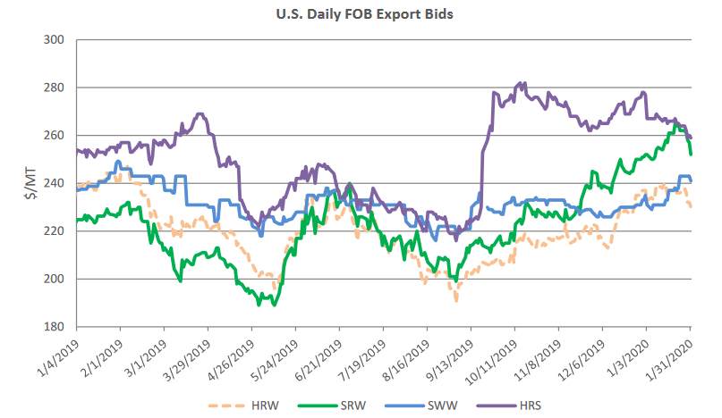 Цены на пшеницу в США росли и снижались в течение января. Цена Hard Red Winter (HRW) упала на 7 долларов за тонну до 230 долларов. Soft Red Winter (SRW) выросла на один доллар за тонну до 252 долларов, поскольку объемы поставок этого класса все еще ограничены. Оба класса продемонстрировали заметное снижение цены к концу месяца из-за дождей, а также из-за опасений замедления экспорта. Soft White Winter (SWW) выросла на 8 долларов за тонну до 241 доллара, благодаря устойчивому экспортному спросу. Hard Red Spring (HRS) подешевела на 19 долларов за тонну до 259 долларов, вероятно, из-за ослабления логистических ограничений на северо-западе Тихого океана.