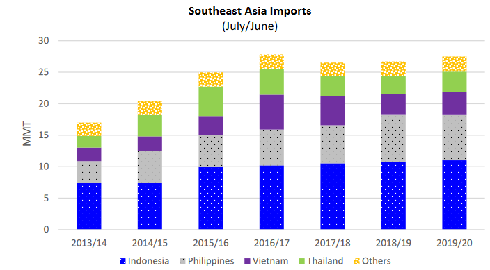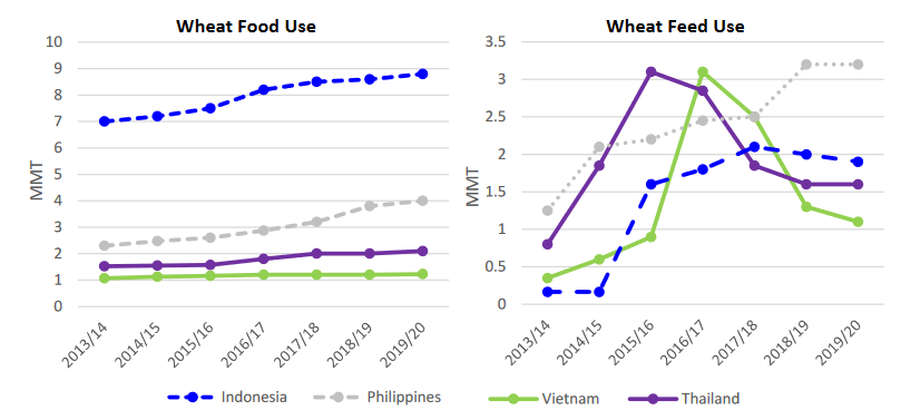 Вкусы и предпочтения потребителей в Юго-Восточной Азии изменились по мере роста населения и доходов на душу населения. Теперь в их рационе больше продуктов на основе мяса и пшеницы. Тем не менее, тропический климат региона ограничивает производство пшеницы, что требует импорта для удовлетворения растущего спроса на пшеницу как для пищевых, так и для кормовых целей. С 2013/14 года общий объем импорта пшеницы в Юго-Восточную Азию увеличился более чем на 60 процентов до 26,7 миллиона тонн в 2018/19 году и прогнозируется на уровне 27,5 миллиона тонн в 2019/20 году. Индонезия и Филиппины являются вторыми и третьими мировыми импортерами пшеницы (после Египта) в регионе.