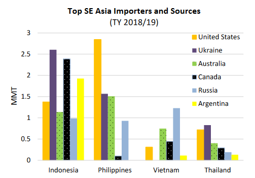 Основными поставщиками в Юго-Восточную Азию являются США, Украина и Австралия, за ними следуют Канада и Россия. Австралия, из-за своей близости, поставляла почти 40 процентов пшеницы в 2016/17 году. Тем не менее, 3 года засухи подряд привели к низким поставкам и высоким ценам, что позволило конкурентам получить долю рынка.