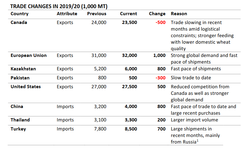 Мировое производство незначительно снизилось из-за низкой урожайности в Марокко. Мировая торговля, напротив, продемонстрировала небольшой рост, благодаря повышению спроса со стороны Китая и Турции. Увеличение экспорта в Европейский Союз, Казахстан и США более чем компенсировало снижение поставок из Канады. Прогнозируемая средняя сезонная цена на ферме в США не изменилась и составляет 4,55 долл. США за бушель.