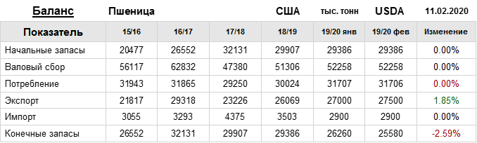 За прошедший месяц министерство сельского хозяйства США (USDA) на 11.02.2020 пересмотрело Баланс пшеницы для США в сезоне 19/20 следующим образом: