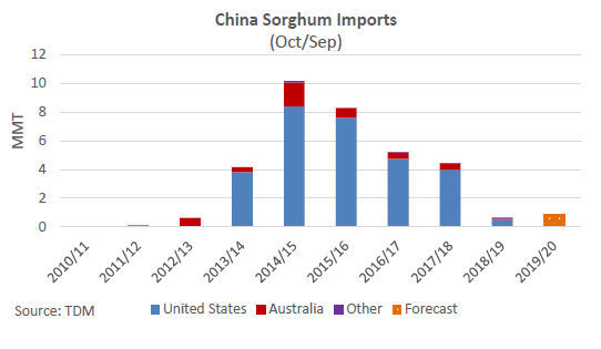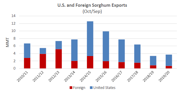 Текущий прогноз экспорта сорго на 2019/20 год (октябрь-сентябрь) для стран, кроме США, является третьим среди самых низких в базе данных USDA. Ожидается, что мировой экспорт сорго будет пятым среди самых низких в истории, хотя перспективы Соединенных Штатов несколько улучшились по сравнению с предыдущим годом. Производство сорго в Соединенных Штатах, Аргентине и Австралии за последнее десятилетие имело тенденцию к уменьшению, причем, в частности, прогнозируется, что производство в Австралии, пострадавшей от засухи, будет самым низким с 1969/70 года, что негативно скажется на глобальных экспортных поставках.