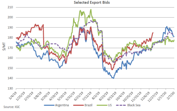 С момента публикации январского отчета WASDE цены в США стали ниже, чем у других крупных экспортеров. Бразильские цены остаются сезонно недоступными. Аргентинские цены выросли на 5 долларов за тонну до 181 доллара, а черноморские — на 7 долларов за тонну до 183 долларов из-за высокого внешнего спроса. Цены в США выросли на 3 долл. / т до 178 долл., что отражает крупные недавние продажи, о чем свидетельствуют отчеты об экспортных продажах.