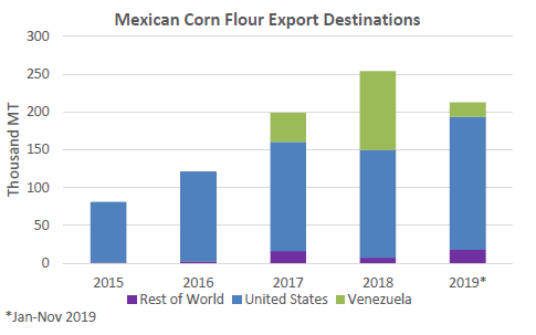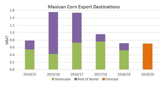 За последние несколько лет сокращение экспорта кукурузы в Мексике было компенсировано ростом экспорта кукурузной муки. Мексика является девятым по величине производителем кукурузы в мире и в основном производит и экспортирует белую кукурузу, которая широко используется в качестве продовольствия во всем мире. Хотя за этот период экспорт резко сократился, ее экспортные рынки распределены между соседними странами, Европой и Африкой. За исключением 2015/16 и 2016/17 годов, Венесуэла была основным направлением, на которое приходилось более половины экспорта кукурузы из Мексики. Однако ограничительная политика Венесуэлы в отношении иностранной валюты, импорта и продаж продовольствия ослабила перспективы импорта.