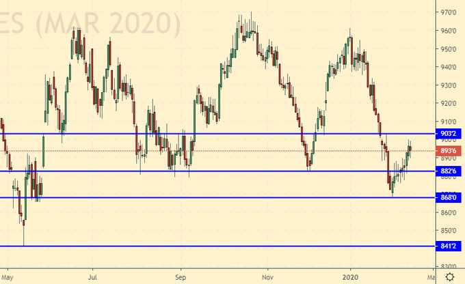 Сценарий роста: рассматриваем мартовский фьючерс, дата экспирации 13 марта. Вероятно, это все на что способен рынок на данный момент. Выше 900.0 мы не пойдем. Объемы потребления сои из-за событий в Китае не будут расти.