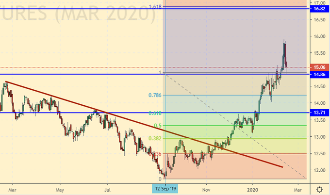 Сценарий роста: рассматриваем мартовский фьючерс, дата экспирации 28 февраля. Сокращение производства в Индии и Бразилии привело к росту цен. Потенциал хода к 16.80 виден невооруженным глазом. Дальнейшее увеличение стоимости пока поставим под вопрос.