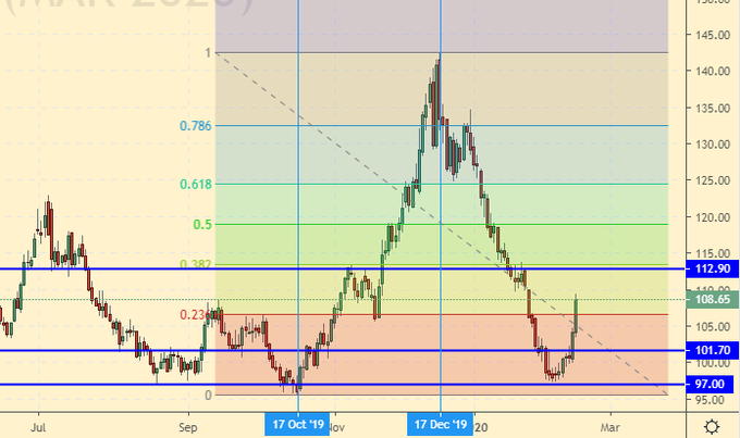 Сценарий роста: рассматриваем мартовский фьючерс, дата экспирации 19 марта. Вошли от 102.0. Если в будущем рынок преодолеет 145.0 мы сможем рассчитывать на движение к 170.0. Пока же нам хватит хода к 120.0.
