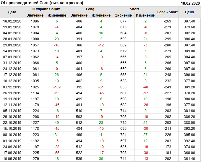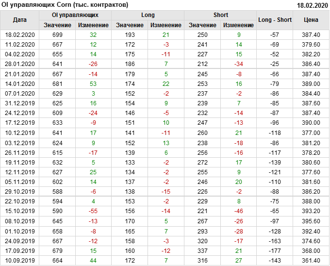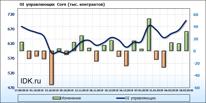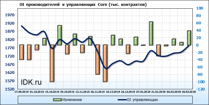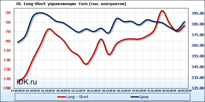 За прошлую неделю, 12.02.20 — 18.02.20, разница между длинными и короткими позициями управляющих выросла на 12 тыс. контрактов. В тоже время, цена выросла на 7.8 цента. Управляющие наращивают позиции, разгоняя тем самым рост цен, что говорит нам о текущей силе рынка.