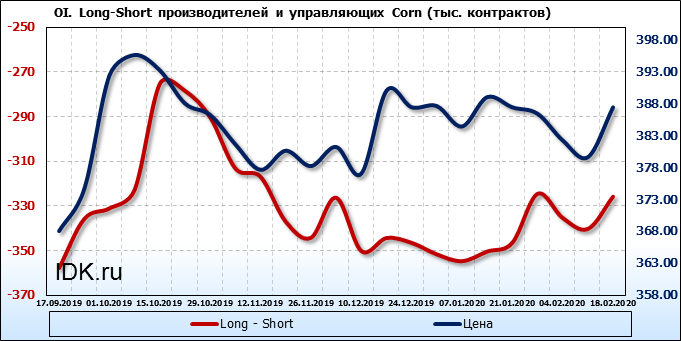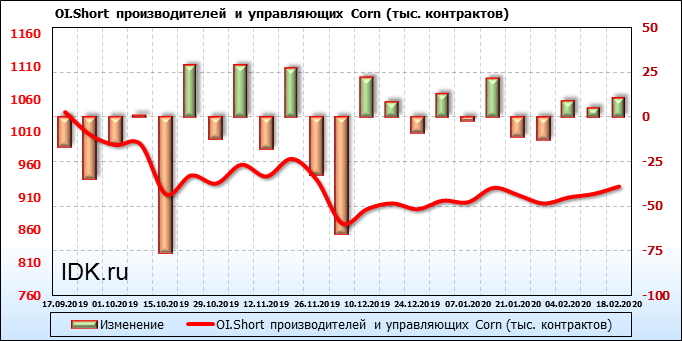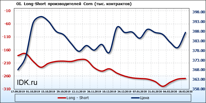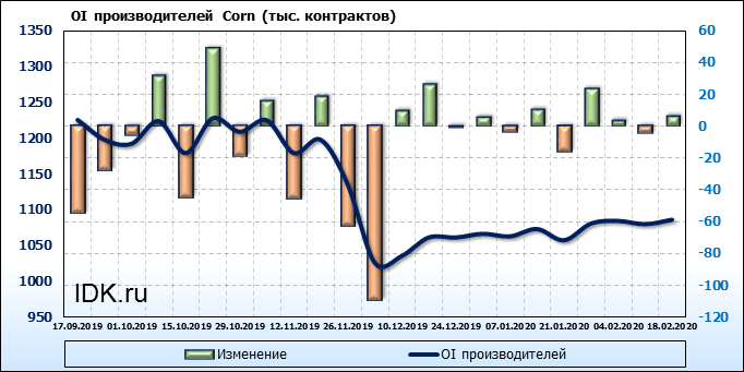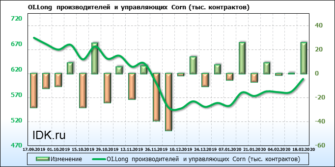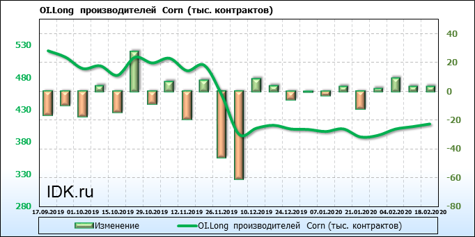 За прошлую неделю, 12.02.20 — 18.02.20, разница между длинными и короткими позициями производителей выросла на 2 тыс. контрактов. В тоже время, цена выросла на 7.8 цента. Производители не торопятся наращивать продажи, предполагая, что возможен рост цены в ближайшее время.