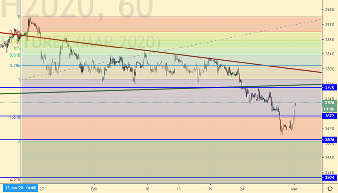 Кукуруза: текущий отскок можно использовать для продаж. Пока рынок ниже 380.0 ничего, кроме возможностей для входа в шорт, искать не нужно. Судя по тому, что и Китай, и Южная Корея отрапортовали о росте числа зараженных на 500 человек за сутки говорить о том, что потребление кормовых культур вырастет не приходится. Карантин будет влиять на доходы людей, что приведет к падению спроса, в том числе и на мясо.
