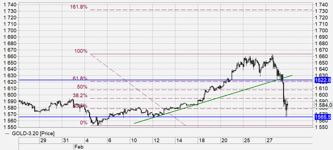 Золото: если мы пройдем ниже 1560, это может спровоцировать дальнейшее падение. Еще в пятницу утром было сложно себе представить, что на фоне падения на рынке акций золото также снизится, причем ниже 1600, однако, на утро понедельника это факт. Два фактора могли повлиять на такой результат: падение производства электронных компонентов и предметов роскоши просматривается. Кроме того, часть инвесторов уходит из золота, бросая свои резервы на поддержание позиций на рынке акций. Глупо, но и такой сценарий исключать мы не можем. Пока мы выше 1565 можно покупать, тем более, что Азия восстанавливается на данный момент.