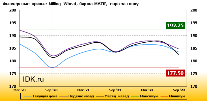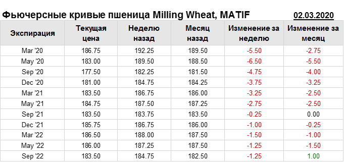 На 02.03.2020 стоимость пшеницы Milling Wheat на бирже MATIF по контракту Mar ’20 составила 186.75 евро за тонну. За прошедшую неделю стоимость пшеницы Milling Wheat упала на 5.5 евро/тонна. Как мы видим на графике, фьючерсная кривая имеет периоды, когда более дальний фьючерс дешевле ближнего. Состояние бэквардации наблюдаем на следующих контрактах: May ’20, Sep ’20, Sep ’21, May ’22, Sep ’22. Таким образом, трейдеры предполагают, что возможно превалирование предложения над спросом в указанные периоды.