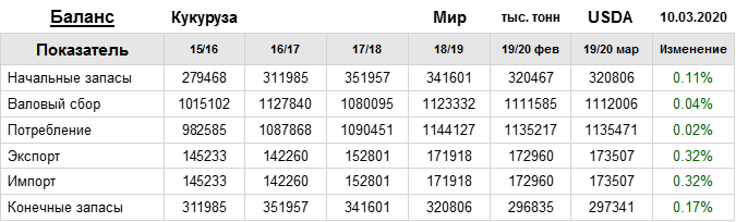 Согласно мартовскому отчету USDA, мировое производство кукурузы увеличено на 0,4 млн. тонн, поскольку увеличение для Южной Африки частично нивелируется сокращением для Индии, Перу и России. Основные изменения в мировой торговле для 2019/20 года включают увеличение прогнозируемого экспорта кукурузы для Украины, Южной Африки и ЕС. Экспорт Бразилии для маркетингового года, заканчивающегося в феврале 2020 г., снижен из-за меньших, чем ожидалось, поставок в конце сезона. Импорт кукурузы в 2019/20 году увеличен для Канады и Перу, но снижен для Филиппин. Мировые конечные запасы кукурузы, на уровне 297,3 млн. тонн, повышены на 0,5 млн. по сравнению с прошлым месяцем.