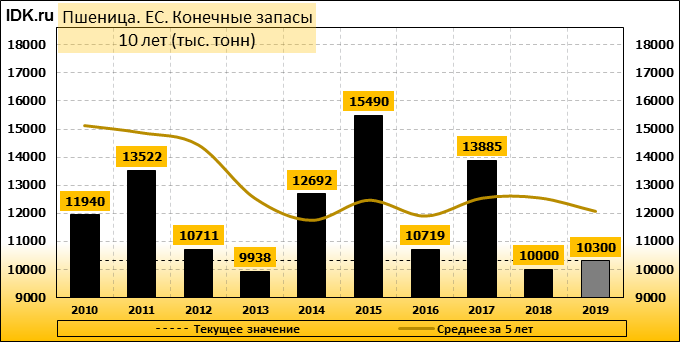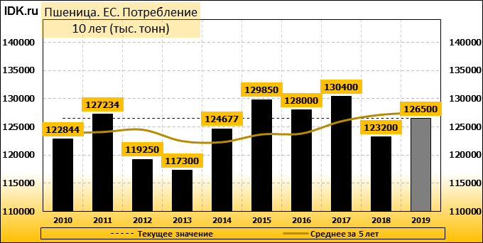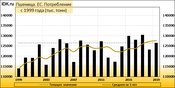 Производство пшеницы в Европейском Союзе в 2019/20 году оценивается в 154,0 млн. метрических тонн, т.е. без изменений с прогноза в прошлом месяце, и на 17,14 млн. тонн (12,52 процента) больше, чем было произведено в прошлом году. Площадь пшеницы как и в феврале оценивается в 26,07 млн. га. Ожидаемая урожайность также не изменилась и оценивается в 5,91 метрической тонны с гектара (т / га). Прогноз по экспорту пшеницы из ЕС в этом месяце остался на уровне 31 млн. тонн, а импорт снижен на 500 тыс. тонн до 4,8 млн. тонн на основе темпов торговли.