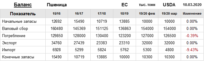 За прошедший месяц министерство сельского хозяйства США (USDA) на 10.03.2020 пересмотрело Баланс пшеницы для ЕС в сезоне 19/20 следующим образом: