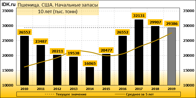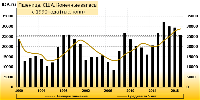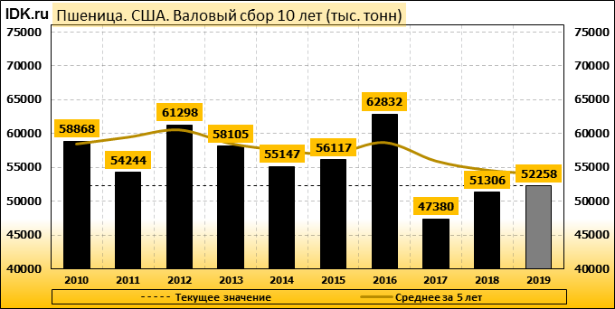Прогноз спроса и предложения для пшеницы в США на 2019/20 г. в этом месяце не изменился. Производство пшеницы в США прогнозируется на уровне 52,26 млн. тонн, что на 0,95 млн. тонн или 1,86 процента больше, чем было произведено в предыдущем году. Площадь пшеницы при этом оценивается в 15,04 млн. га, а урожайность — в 3,47 метрической тонны с гектара. Согласно прогнозу USDA, экспорт пшеницы из США составит 27,5 млн. тонн. Конечные остатки, как и в предыдущем месяце, прогнозируются на уровне 25,58 млн. тонн.