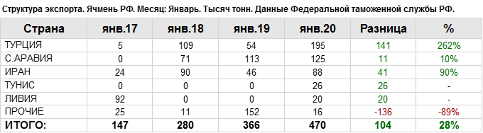 Объем поставок ячменя на экспорт за период с июля 2019 года по январь 2020 года в Турцию составил 279.71 тыс. тонн, что на 55.57 тыс. тонн больше объема поставок в данную страну в прошлом сезоне на тот же отчетный месяц.