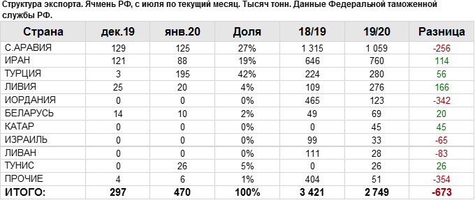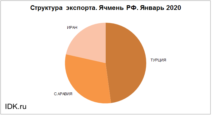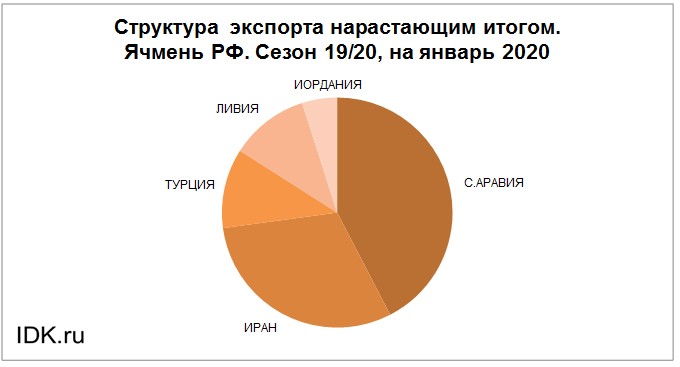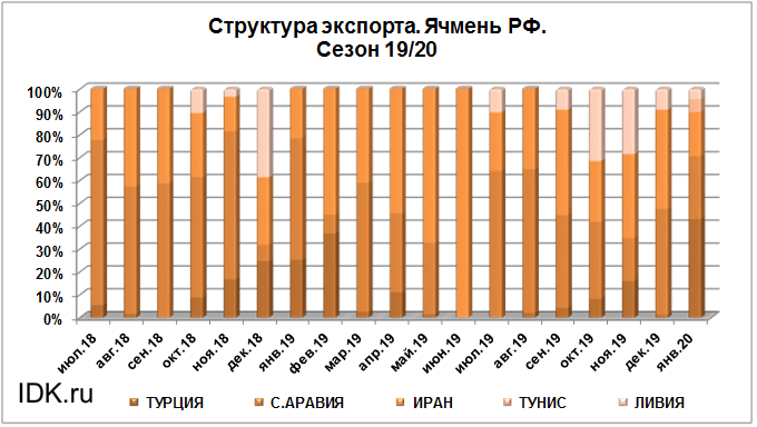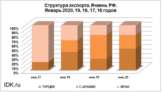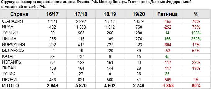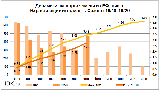 Объем поставок ячменя на экспорт за период с июля 2019 года по январь 2020 года в Иран составил 759.7 тыс. тонн, что на 113.91 тыс. тонн больше объема поставок в данную страну в прошлом сезоне на тот же отчетный месяц.