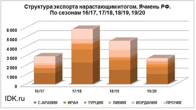 Структура экспорта ячменя из России нарастающим итогом по сезонам