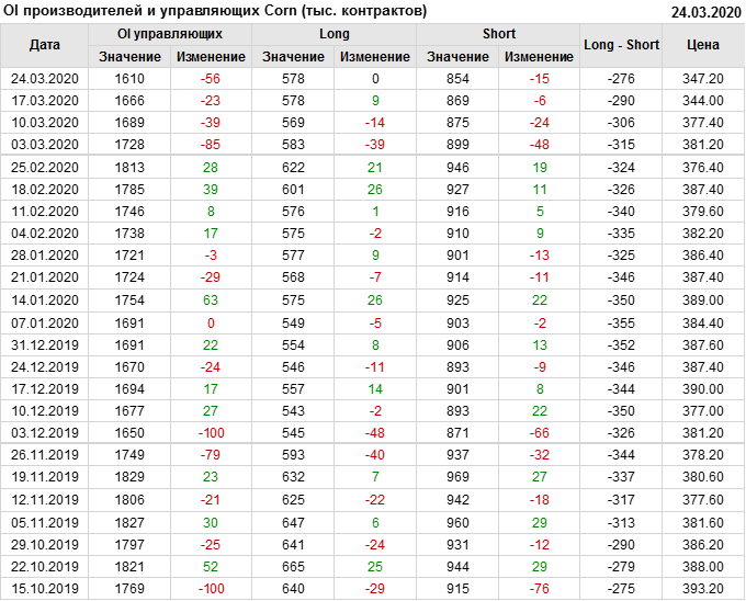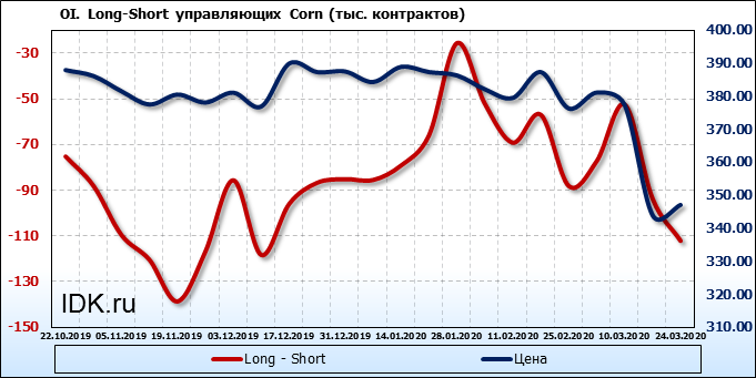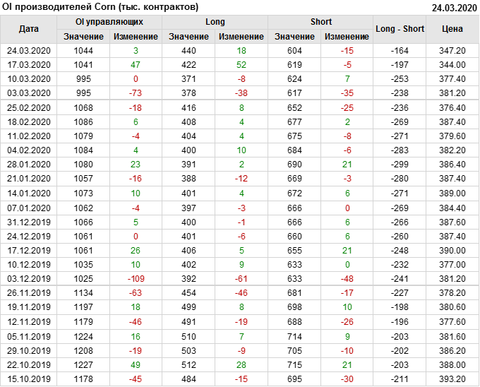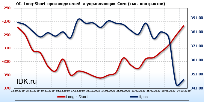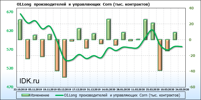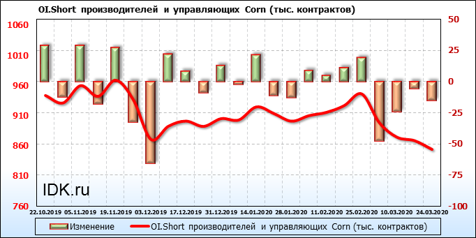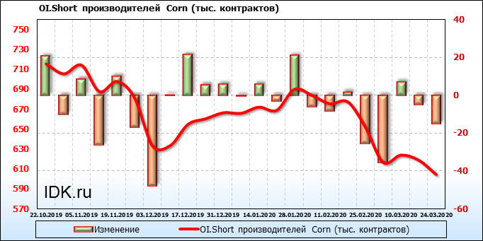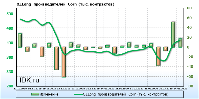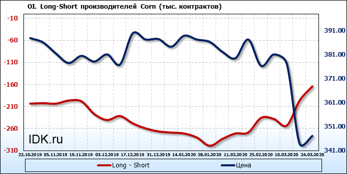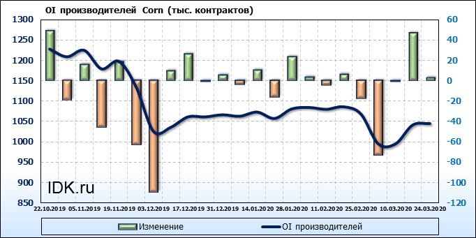 За прошлую неделю, 18.03.20 — 24.03.20, разница между длинными и короткими позициями производителей выросла на 33 тыс. контрактов. В тоже время, цена выросла на 3.2 цента. Производители не торопятся наращивать продажи, предполагая, что возможен рост цены в ближайшее время.
