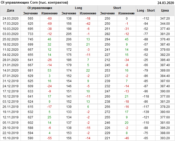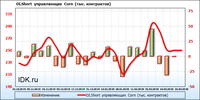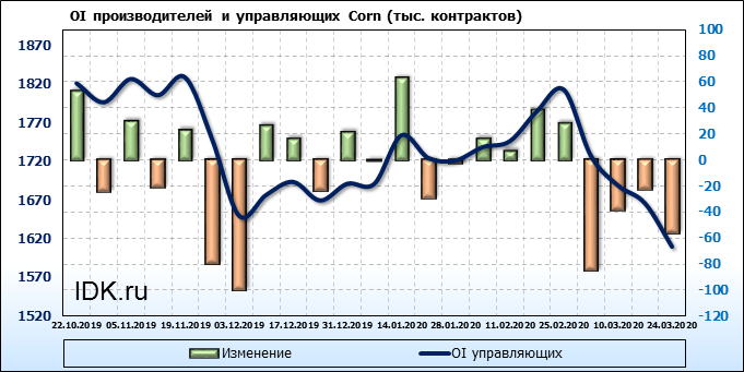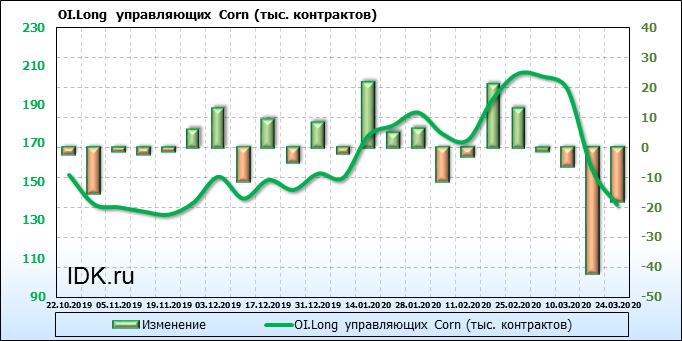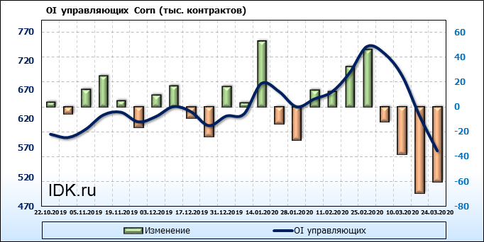 За прошлую неделю, 18.03.20 — 24.03.20, разница между длинными и короткими позициями производителей и управляющих выросла на 14 тыс. контрактов. За отчетный период времени, цена выросла на 3.2 цента. Совокупно производители и управляющие наращивают длинные позиции, поддерживая рост цен. Это сильная комбинация, которая должна вызывать доверие у всё большего числа быков.
