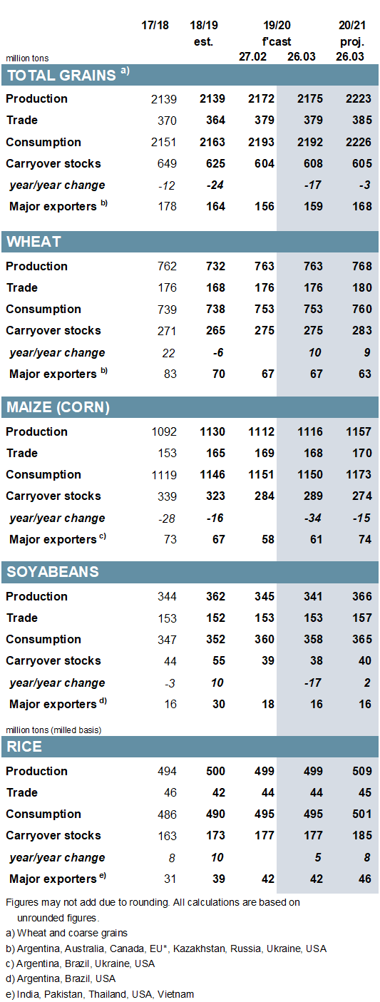 Прогнозируется, что глобальные общие запасы зерна (пшеницы и кормового зерна) в 2019/20 году на уровне 2 799 млн. тонн будут несколько выше прошлогодних и лишь незначительно ниже рекордного уровня двухлетней давности, поскольку увеличение производства более чем компенсирует сокращение начальных остатков. С учетом того, что спрос прогнозируется на рекордном уровне и опережает небольшой прирост предложения, конечные остатки сократятся до четырехлетнего минимума, почти полностью из-за сокращения для кукурузы, особенно в Китае. Торговля ожидается на рекордном уровне, включая увеличение поставок пшеницы, кукурузы, ячменя и сорго.