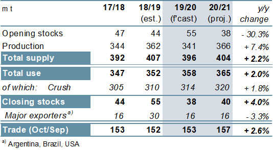На фоне снижения производства в США, мировое производство сои в 2019/20 году, как ожидается, сократится на 21 млн. тонн по сравнению с предыдущим годом до 341 млн. тонн. Поскольку ожидается, что потребление достигнет нового пика, остатки резко сократятся, в США — более чем вдвое. Увеличение поставок в Азию может способствовать росту мировой торговли на 1%. В связи с потенциальным ростом в США, мировой объем производства в 2020/21 году прогнозируется на рекордном уровне в 366 млн. тонн, что на 7% больше, чем в прошлом году. При ожидаемом умеренном увеличении потребления, запасы, скорее всего, останутся ниже среднего. Согласно прогнозу, мировой спрос на импорт возрастет до 157 млн. тонн.