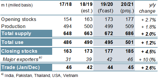 Прогнозы Совета по мировому предложению и спросу на рис в 2019/20 г. в целом не изменились с прошлого месяца, при этом объемы переходящих остатков повышены до 177 млн. тонн при накоплении их в Китае и Индии. Вследствие увеличения посевных площадей основных экспортеров, мировое производство риса в 2020/21 году, согласно прогнозу, вырастет на 2%, достигнув 509 млн. тонн, при этом рост населения будет поддерживать рекордное потребление. Ожидается дальнейший рост остатков, в основном у ключевых экспортеров и Китая. Объем торговли, как ожидается, увеличится на 3% благодаря увеличению поставок в Африку, при этом Индия будет ведущим экспортером.