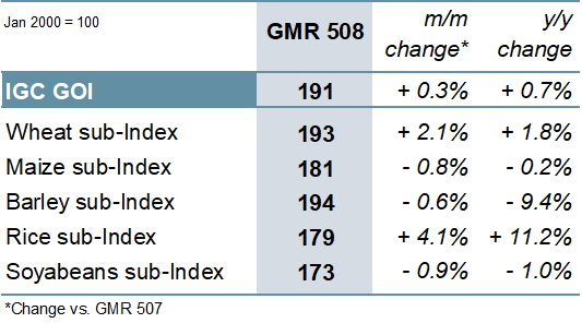 Индекс зерновых и масличных культур IGC (GOI) показал незначительное общее изменение с прошлого месяца, так как первоначальное снижение некоторых компонентов изменило направление в течение месяца.