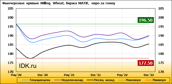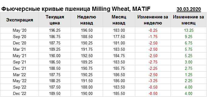 На 30.03.2020 стоимость пшеницы Milling Wheat на бирже MATIF по контракту May ’20 составила 196.25 евро за тонну. За прошедшую неделю стоимость пшеницы Milling Wheat упала на 0.25 евро/тонна. Как мы видим на графике, фьючерсная кривая имеет периоды, когда более дальний фьючерс дешевле ближнего. Состояние бэквардации наблюдаем на следующих контрактах: Sep ’20, Sep ’21, Mar ’22, Sep ’22. Таким образом, трейдеры предполагают, что возможно превалирование предложения над спросом в указанные периоды.