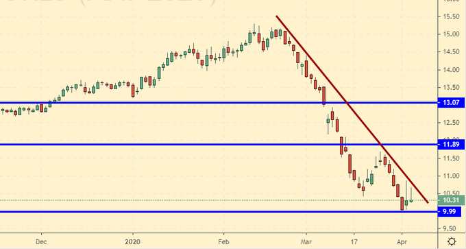 Сценарий роста: рассматриваем майский фьючерс, дата экспирации 30 апреля. Видим, что есть продавцы от 11.00 поэтому, ждем роста выше 11.00 и покупаем. Если пробоя 11.00 не последует, то нас ждут экстремально низкие уровни на 9.00.