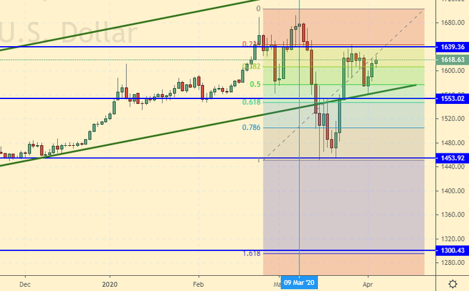Сценарий роста: сильный рост будет если только экономика США начнет схлопываться. 10 миллионов новых безработных за две недели пока угрозы не представляют. Тем более, что доллары можно печатать (рисовать нули на счетах) практически бесконечно. Если мы вновь пробьемся выше 1650 – покупать.