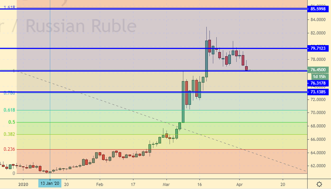 Цены на нефть марки Urals, в условиях пандемии, перепроизводства и передела сфер влияния, вряд ли вернуться к уровню 35.00, что создает предпосылки для продолжения ослабления национальной валюты. Возможный спуск к 74.00 продолжаем рекомендовать для покупок.