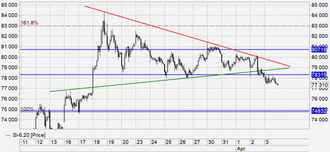 Продажа: нет. Кто в позиции от 78.40, перенесите стоп на 78.60. Цель: 74.10.