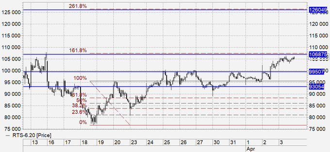 Индекс РТС: пришли к 106000. Здесь надо продавать. Прорыв выше 106000 откроет дорогу к 125000. Если это произойдет, а никаких фундаментальных причин для продолжения роста нет, то шорт от 125000 просто обязателен. Пытаться встать в лонг можно только после появления уверенности в том, что рынок нефти в перспективе будет сбалансирован (Эр-Рияд, Москва, Вашингтон и др.).
