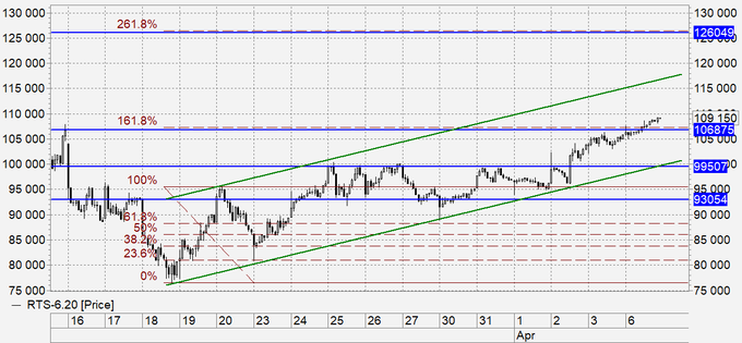 Индекс РТС: вариант с ростом выше 106000 мы не отвергали, но открывшийся ход к 125000 это перебор. Разве где-то что-то проснулось, возобновилась торговля, началось импортозамещение? К сожалению, ситуация в России продолжит ухудшаться в ближайшие недели. Скупать сейчас российские акции могут только сами собственники. Что ж… будем продавать от 125000.