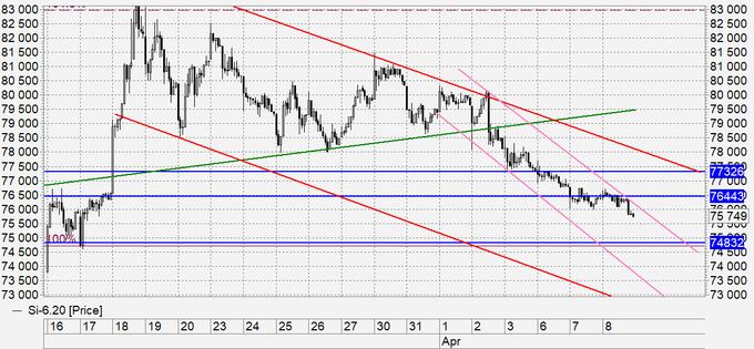 Продажа: нет. Кто в позиции, перенесите стоп на 76700. Цель: 75000. Можно зафиксировать до 50% прибыли.