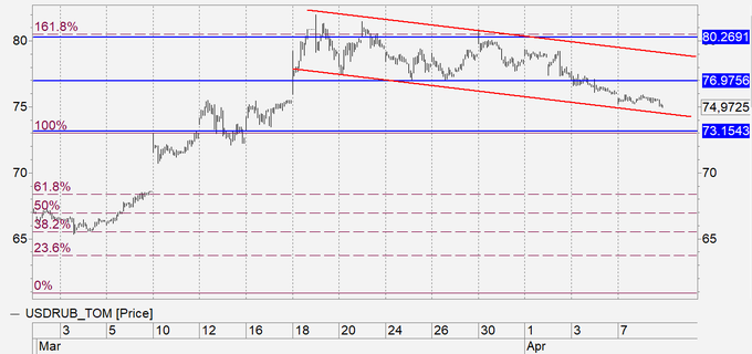 Рубль: рынок будет ждать решения ОПЕК+ и последующего изменения цены на нефть. Если результаты встречи окажутся отрицательными это приведет к падению рубля. При каком-либо позитивном решении мы можем ожидать спуска пары к 74.00. Завтра в США выходной, Страстная Пятница, что может вызвать сильный гэп в понедельник, так как судьба цен на нефть из-за риска затягивания переговоров ОПЕК+ пока не ясна.