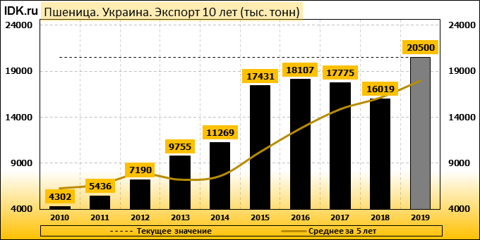 Согласно апрельскому отчету Министерства Сельского Хозяйства США, прогноз производства пшеницы в Украине на 2019/20 год составляет 29,17 млн. тонн. Это на 0,17 млн тонн больше объема, который прогнозировался в прошлом месяце, и на 16,42 процента или на 4,11 млн. тонн больше, по сравнению с прошлым годом. Прогнозируемая площадь при этом сократилась с 7,05 млн. га до 7,02 млн. га. Урожайность напротив увеличена с 4,11 до 4,16 тонны с гектара. Прогноз по экспорту пшеницы из Украины остался без изменений и составляет 20,5 млн. тонн.