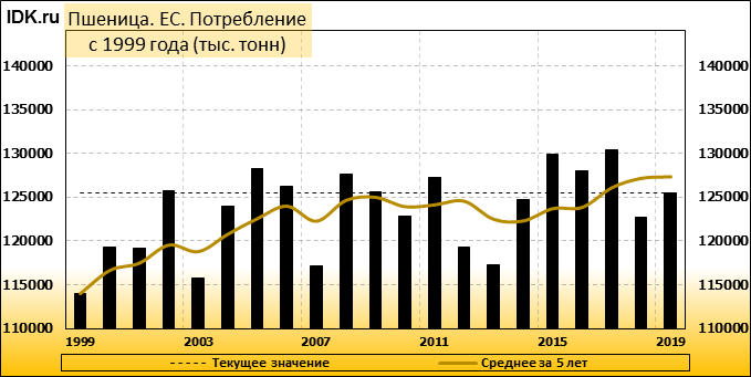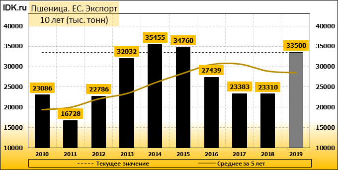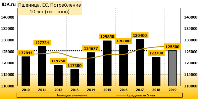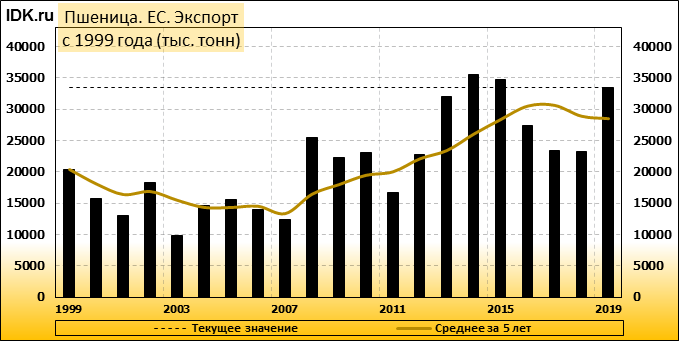 Производство пшеницы в Европейском Союзе в 2019/20 году оценивается в 154,0 млн. метрических тонн, т.е. без изменений по сравнению с прогнозом прошлого месяца, и на 17,14 млн. тонн (12,52 процента) больше, чем было произведено в прошлом году. Площадь пшеницы как и в марте оценивается в 26,07 млн. га. Ожидаемая урожайность также не изменилась и оценивается в 5,91 метрической тонны с гектара (т / га). Прогноз по экспорту пшеницы из ЕС в этом месяце повышен на 1,5 млн. тонн до 33,5 млн. тонн на основе высоких темпов торговли и снижения конкуренции со стороны России.