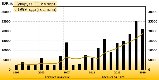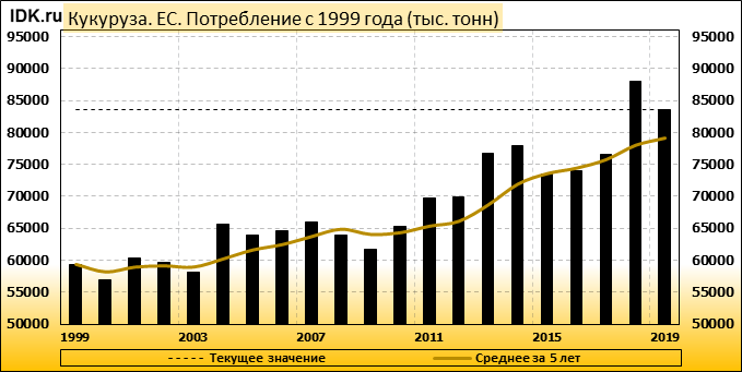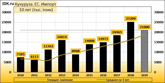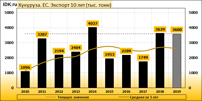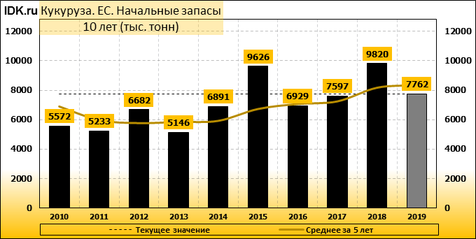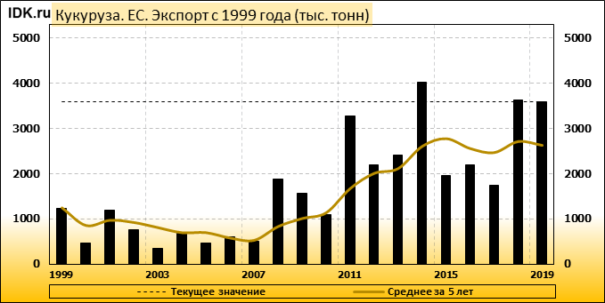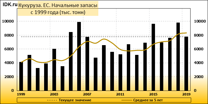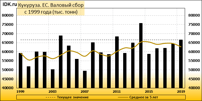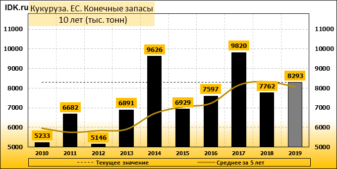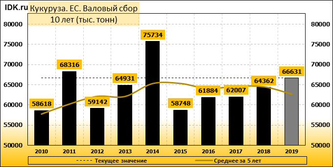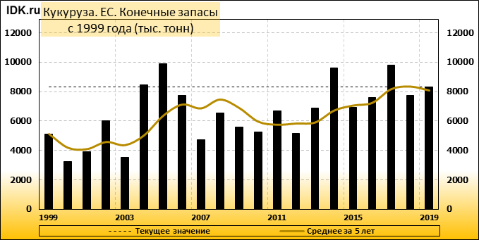 В новом отчете WASDE Министерства Сельского Хозяйства США прогноз производства кукурузы в Европейском союзе на 2019/20 год повышен с 65,0 млн. тонн до 66,63 млн. тонн, что на 2,27 млн. тонн или 3,53 процента больше, чем было произведено в предыдущем году. Повышение прогноза произошло за счет пересмотра как площади, так и урожайности кукурузы. Ожидаемая площадь повышена с 8,70 до 8,88 млн. га, а урожайность — с 7,47 до 7,50 т/га. Прогнозируемый экспорт кукурузы из ЕС на 2019/20 год повышен на 700 тыс. тонн до 3,6 млн. тонн на основе высоких темпов торговли.
