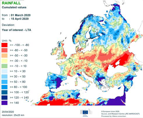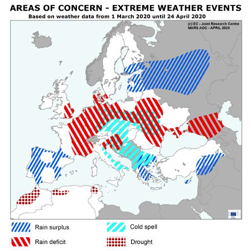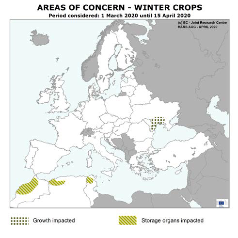В Западной Европе наблюдался один из самых засушливых периодов ранней весны с 1979 года — после очень влажной зимы — почти без осадков с середины марта. Обширные части Польши, Украины и Румынии также столкнулась с засушливыми условиями с конца зимы. Озимые культуры в большинстве этих регионов все еще находятся в хорошем состоянии, но для поддержания позитивного прогноза урожайности требуется больше дождей. Очень сухие верхние слои почвы оказывают негативное влияние на посев и появление всходов яровых культур. Продолжительная засуха в Марокко привела к снижению ожидаемой урожайности.