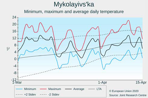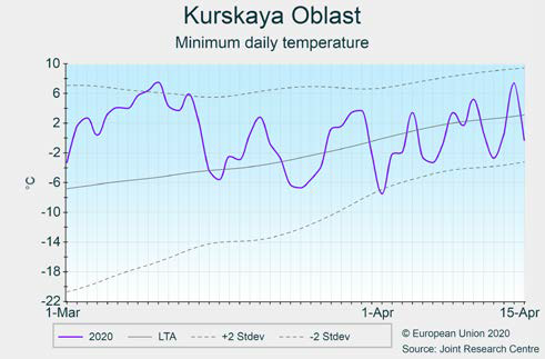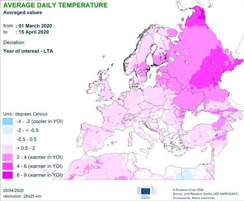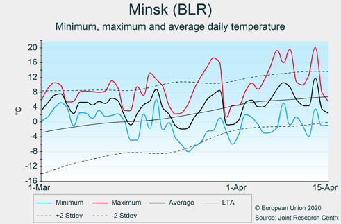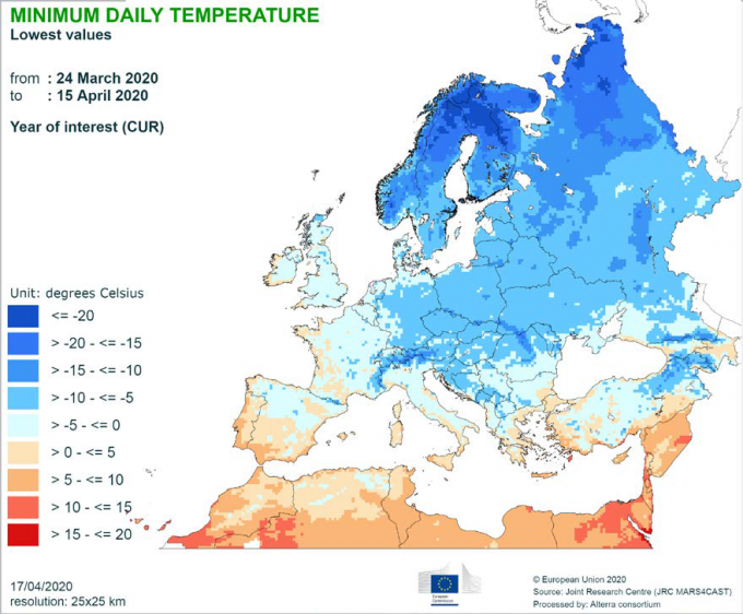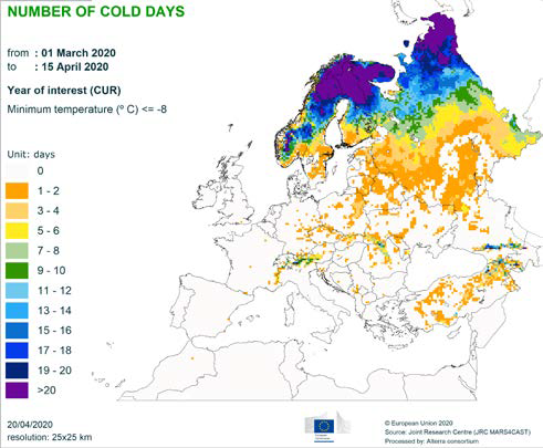 В течение последних 30 дней три волны холодного воздуха достигали Европы, вызвав внезапные падения температуры воздуха около 24 марта, 1 апреля и 15 апреля. Минимальные температуры во время этих холодных периодов падали ниже 0 ° C по всему континенту, за исключением некоторых (главным образом прибрежных) районов Атлантики и Средиземноморья. Заморозки с температурой в диапазоне от -5 ° C до -10 ° C имели место в большинстве стран центральной Европы, странах Балтии и в северной части Румынии, а также восточнее в Украине и России. Во многих регионах минимальная температура, зарегистрированная 1 апреля, была самой низкой в истории наблюдений MARS (с 1979 г.).