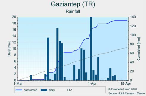 В юго-восточных регионах (Газиантеп, Шанлыурфа, Мардин) погода предоставляла благоприятные температуры и относительно обильные дожди с 20 марта, которые вызвали локальные паводки и заболачивание. Тем не менее, состояние сельскохозяйственных культур в целом остается очень благоприятным, с накоплением биомассы в соответствии со средним показателем за 5 лет.