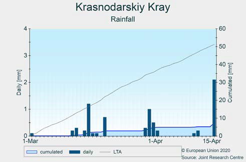 Осадки в течение рассматриваемого периода были близки или выше LTA на большей части территории России, но некоторые важные районы производства озимой пшеницы между Черным и Каспийским морями получили только 5-20 мм осадков. Осадки значительно ниже среднего (лишь 40-70% от LTA) также наблюдалось в западной части Центрально-Черноземного региона, а также в южных частях Поволжья вдоль границы с Казахстаном.
