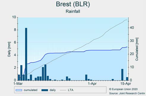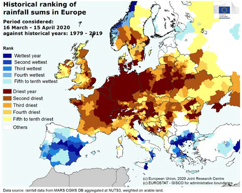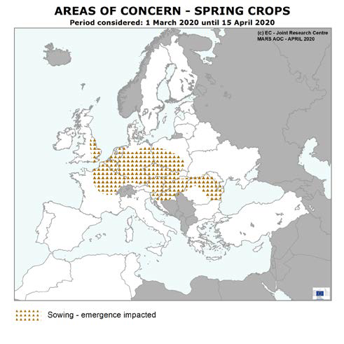 В Западной Европе наблюдался один из самых засушливых периодов ранней весны с 1979 года, который наступил после очень влажной зимы. С середины марта в восточной Франции, восточной части Соединенного Королевства, странах Бенилюкса и Германии почти не было дождей. В этих регионах отсутствие дождей, высокий уровень солнечного излучения и температуры преимущественно выше среднего привели к высыханию верхнего слоя почвы и оказали негативное влияние на посев и появление всходов яровых культур. В Великобритании и Франции столь неблагоприятные условия имеют большое значение, так как ожидается увеличение площади яровых культур взамен озимых, не посеянных из-за неблагоприятных зимних условий.