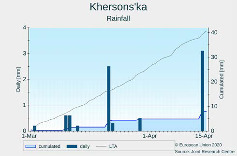 Анализируемый период характеризовался дефицитом дождей, который был особенно значительным на юге. Существенная засуха наблюдается в основных регионах производства озимого ячменя, на юго-западе (Одесская, Николаевская области), где дефицит дождей сохраняется с прошлого лета. В других областях дефицит осадков начался в конце февраля и становится проблемой на юго-востоке, особенно в Запорожье, главном регионе страны, производящем пшеницу. В остальной части страны дефицит дождей оказал ограниченное воздействие, и только поверхностные слои почвы являются сухими.