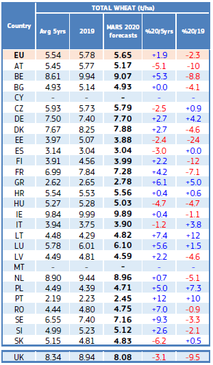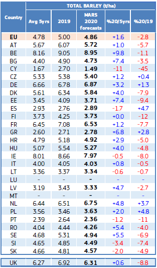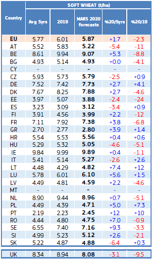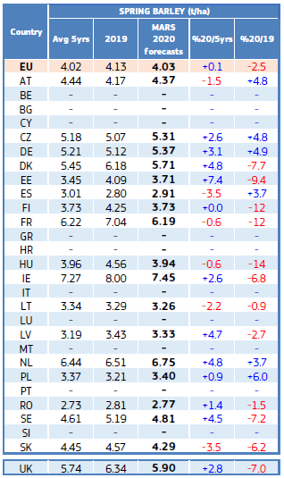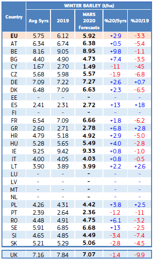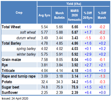 Озимые культуры все еще развиваются опережающими темпами после исключительно мягкой зимы. В марте холодные периоды привели к замедлению развития озимых культур из-за снижения температуры почвы и затруднили посев яровых культур. Влажность почвы в целом удовлетворительна для развития озимых культур, но может привести к неблагоприятным условиям для прорастания яровых культур в засушливых юго-восточных районах страны. Поскольку сезон еще только начался, прогноз урожайности основан на исторических тенденциях и остается близким к среднему.