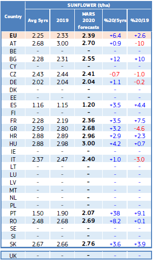 В Болгарии и Греции (2-й и 7-й крупнейшие производители в ЕС) посевная кампания началась на второй неделе апреля. В период с 22 марта по 6 апреля в Греции и на юге Болгарии наблюдались частые дожди, в то время как на севере Болгарии были зарегистрированы температуры ниже среднего, а холодная почва препятствовала посеву подсолнечника.