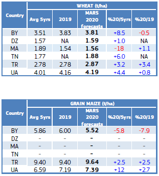 Посев яровых культур начался после холодного периода и в настоящее время продолжается. Дождь необходим для адекватного появления всходов и для начального роста зерновых. Исключительно теплая зима и высокие температуры, наблюдавшиеся до 15 марта, позволили начать ранний посев яровых культур (на месяц раньше обычных сроков посева). Озимые культуры также хорошо развиты, что благоприятно для урожайности; однако ожидается, что засуха на юге повлияет на потенциал урожайности озимых культур. Таким образом, прогноз урожайности сохраняется на уровне, близком к тренду.